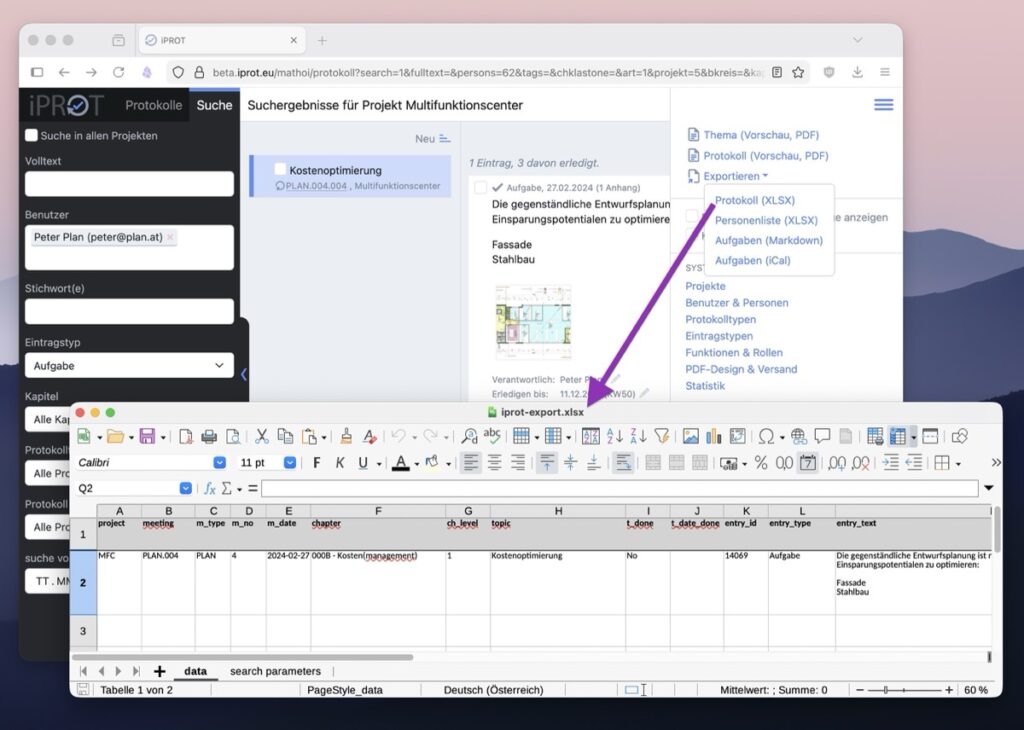 iPROT verfügt über eine noch leistungsfähigere Exportfunktion. Damit lassen sich neben den bereits vorhandenen Möglichkeiten zum Exportieren von Personenlisten und Aufgaben nun auch ganze Protokolle als XLSX-Dateien exportieren und mit anderen Anwendungen weiter verarbeiten. Zudem haben wir alle Exportfunktionen übersichtlich in einem Menü zum Exportieren zusammengefasst.