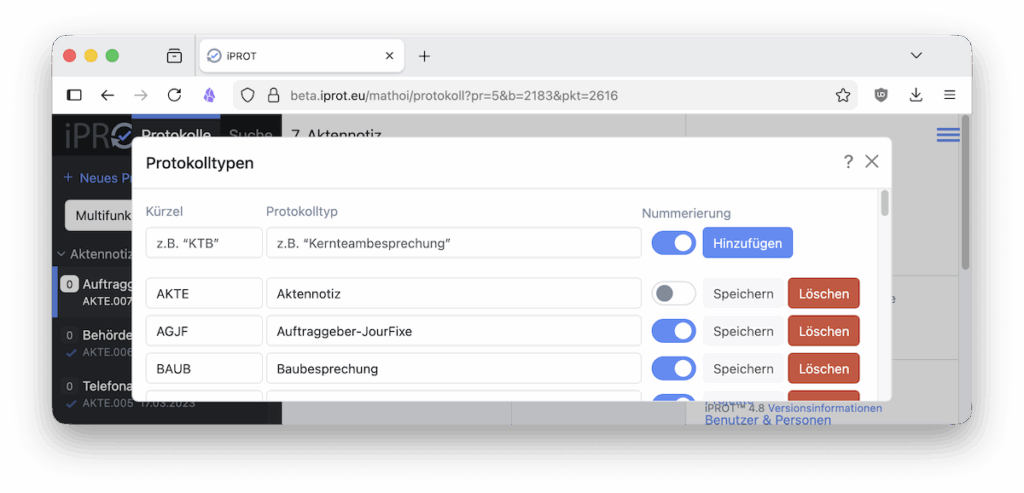 In den Systemeinstellungen zu den Protokolltypen können Sie jetzt entscheiden, ob auf den PDF-Protokollen die fortlaufende Nummerierung des Protokolls angegeben werden soll, oder nicht. Falls Sie keine fortlaufende Nummerierung wünschen, schieben Sie den neuen Slider unter Nummerierung einfach nach links.
